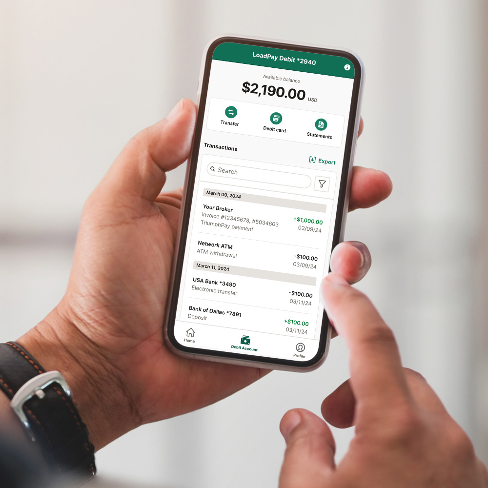 Abra una cuenta bancaria digital LoadPayTM y deposite los pagos por las cargas para cobrar en minutos si elige Factoring powered by Delta o Quick Pay. Además, puede obtener acceso instantáneo a sus fondos, sin esperar cheques, horarios bancarios ni transferencias ACH lentas, y usarlos en cualquier lugar donde se acepte Mastercard®.