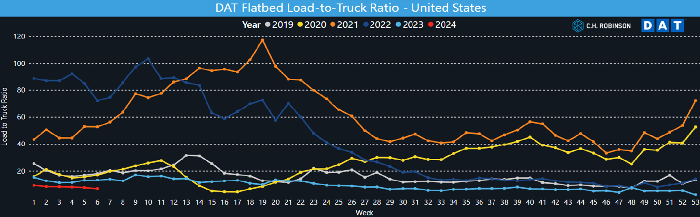 A diferencia de las furgonetas secas y los camiones refrigerados, la capacidad de las plataformas no se vio afectada por las tormentas invernales de enero. El DAT LTR ha disminuido/suavizado este año, incluidas las semanas de las tormentas invernales. Siguiendo las tendencias estacionales estándar, esperamos que se produzca cierto endurecimiento en la segunda quincena de febrero y en marzo. Este endurecimiento a nivel nacional será impulsado por el aumento de la demanda de los estados del sur. La reducción de la capacidad también dará lugar a un aumento de los costes, aunque debido al estado del ciclo del mercado en general, es probable que las disminuciones de la capacidad y los aumentos de los costes sean algo moderados en comparación con años anteriores. Para ponerlo en perspectiva, el promedio de 5 años de DAT LTR es de 31:1, mientras que el año actual, en la semana 6, es de 6,7:1.