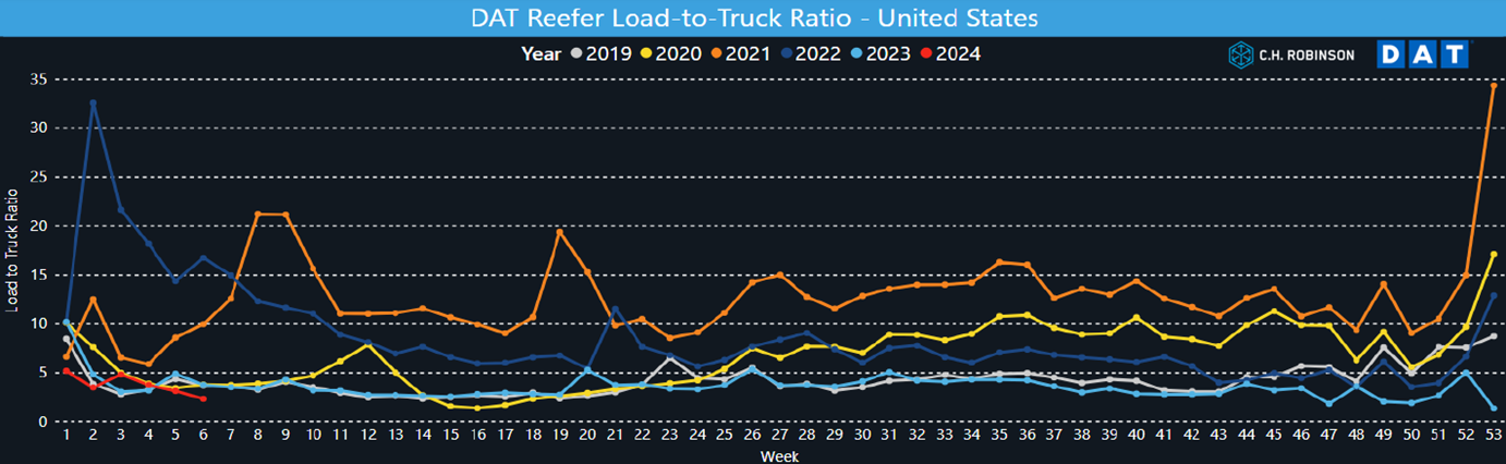 El mercado refrigerado al contado TL muestra un patrón y una suavidad similares a los de la furgoneta seca. Del mismo modo, las tormentas invernales causaron temporalmente rigidez en enero, pero eso ha disminuido desde entonces. La semana 6 muestra un LTR de 2.3:1 en comparación con el promedio de 5 años de 7.1:1.