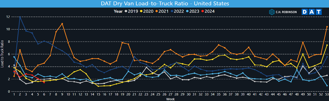 Es probable que las condiciones actuales y las presiones sobre los precios continúen al comienzo del año; ya que tomará algún tiempo para que las terminales amarillas subastadas el mes pasado, como anunciamos en nuestra actualización de mercado anterior, vuelvan a estar operativas. Tenga en cuenta que no habrá un retorno a los niveles de capacidad anteriores, ya que algunas de las terminales no se vendieron a LTL o proveedores de transporte. También existe la incógnita de lo que harán los proveedores de compras con sus terminales de propiedad anterior cercanos, ya que pueden o no seguir funcionando. Es probable que la demanda y el tonelaje sigan una tendencia similar. Se espera que el mercado de carga completa de camiones continúe perdiendo transportistas en la primera mitad del año para dejar de estar sobreabastecido. Si el pronóstico se mantiene y los precios de carga completa comienzan a aumentar en la segunda mitad del año, eso podría llevar a una reversión de la conversión del modelo que se produjo en 2023. Esta conversión de carga a LTL aumentaría el tonelaje y crearía una presión adicional sobre los precios más allá de lo que se mencionó anteriormente.