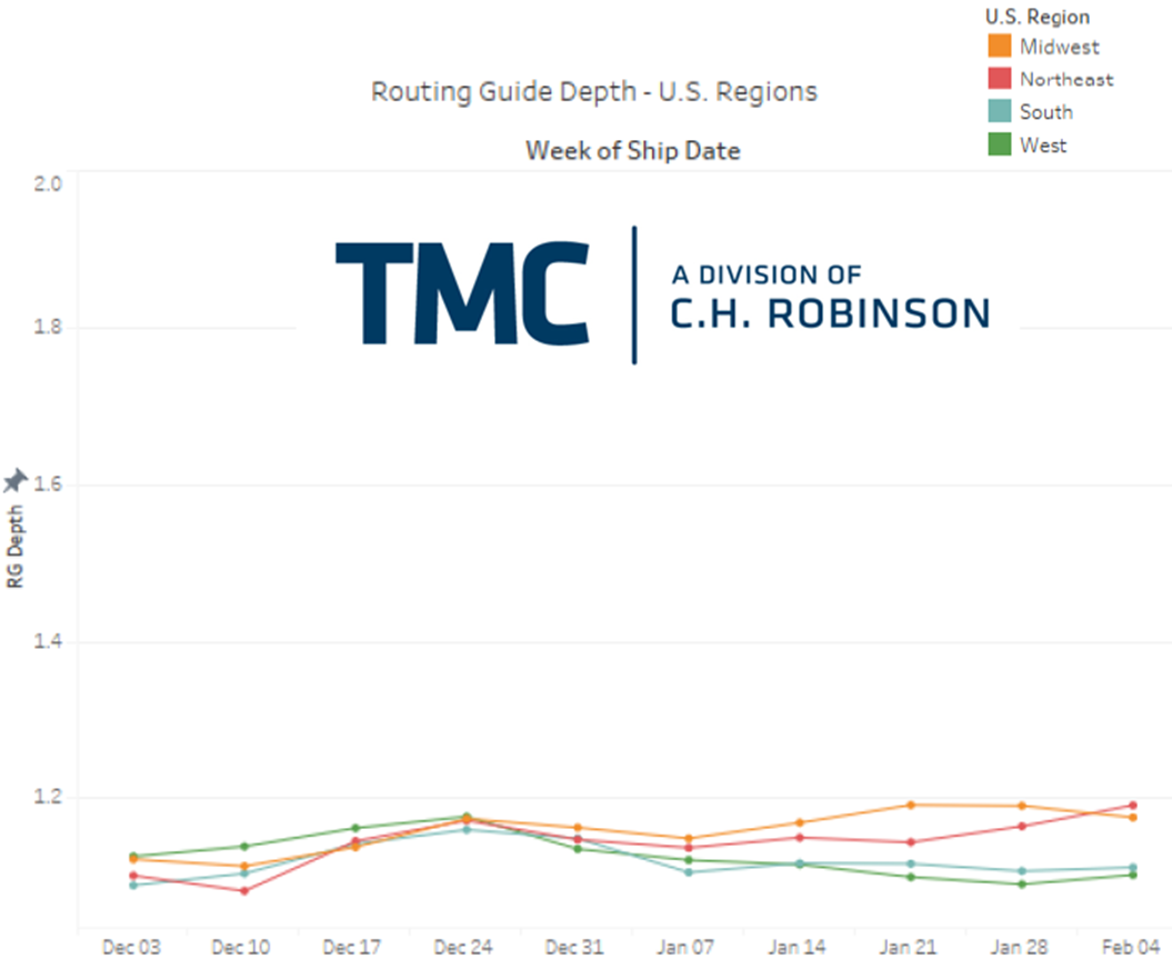 El gráfico anterior de TMC, una división de C.H. Robinson, refleja la profundidad de la guía de enrutamiento semanal a nivel regional en América del Norte.