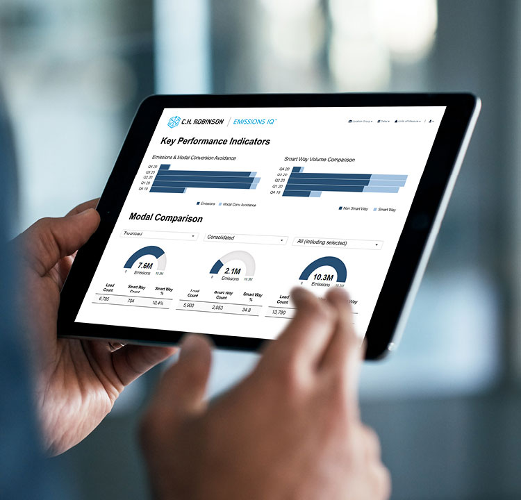 使用 Emissions IQ 制定碳足迹基准,测量和减少碳足迹,这款简单易用的自助服务技术可以按运输方式、位置和零售商计算并以可视化形式呈现排放量。